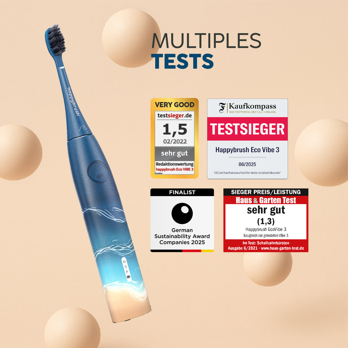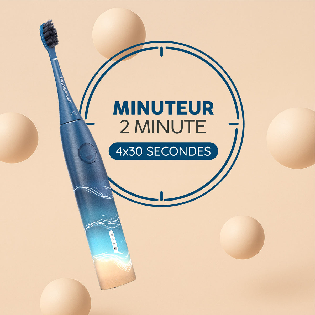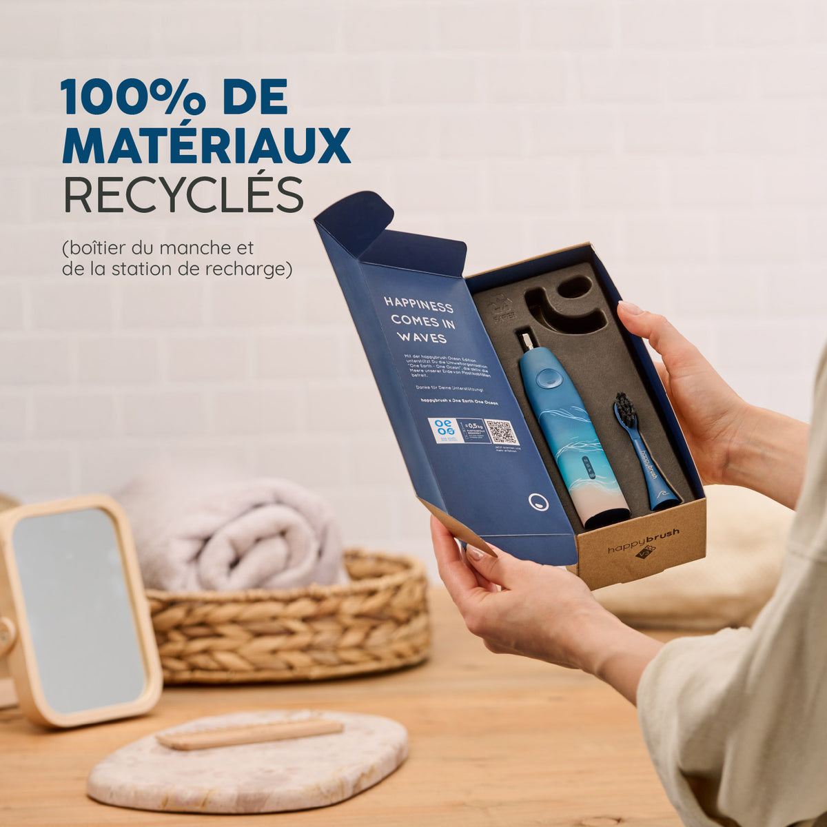 Levez-vous du bon pied avec notre brosse à dents sonique VIBE 3: la première brosse à dents avec un manche 100% matériaux recyclés. Avec jusqu'à 40 000 vibrations par minute, une autonomie de batterie pouvant aller jusqu'à 6 semaines, 3 modes de nettoyage et un système de verrouillage Travel Lock, se brosser les dents devient un jeu d'enfants!