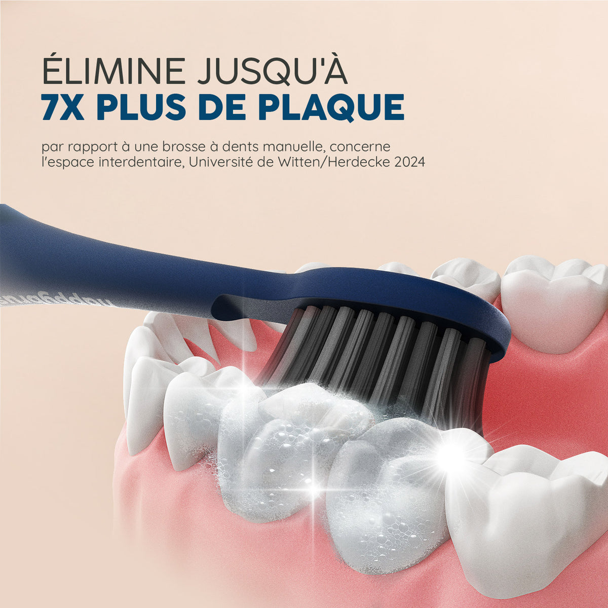 Nos brosses à dents électriques dotées d'une technologie sonique efficace nettoient les dents en profondeur et éliminent jusqu'à 7 fois plus de plaque dentaire qu'une brosse à dents manuelle, y compris dans les espaces interdentaires, Université de Witten/Herdecke 2024.