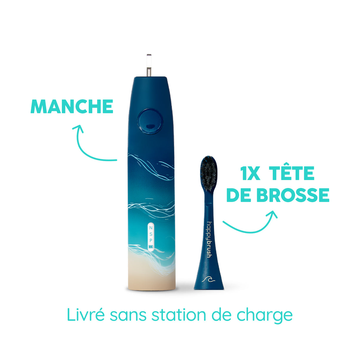 Puisqu'il s'agit d'un échange, le manche de remplacement pour votre brosse à dents sonique VIBE 3 est livré avec une tête de brosse, mais sans chargeur. Bien sûr, la qualité de brossage et les options de notre brosse à dents restent inchangées : jusqu'à 40 000 vibrations par minute, une autonomie de batterie pouvant aller jusqu'à 6 semaines, 3 modes de nettoyage et un système de verrouillage Travel Lock.